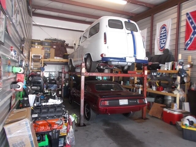 Before I started using the lift, I had to give it a good cleaning. This thing had seen some neglect over the years and the grease was caked on the posts and the runners. Notice, we placed the lift on 4 car dolly's to roll it around until we decided the location I wanted it in the shop.